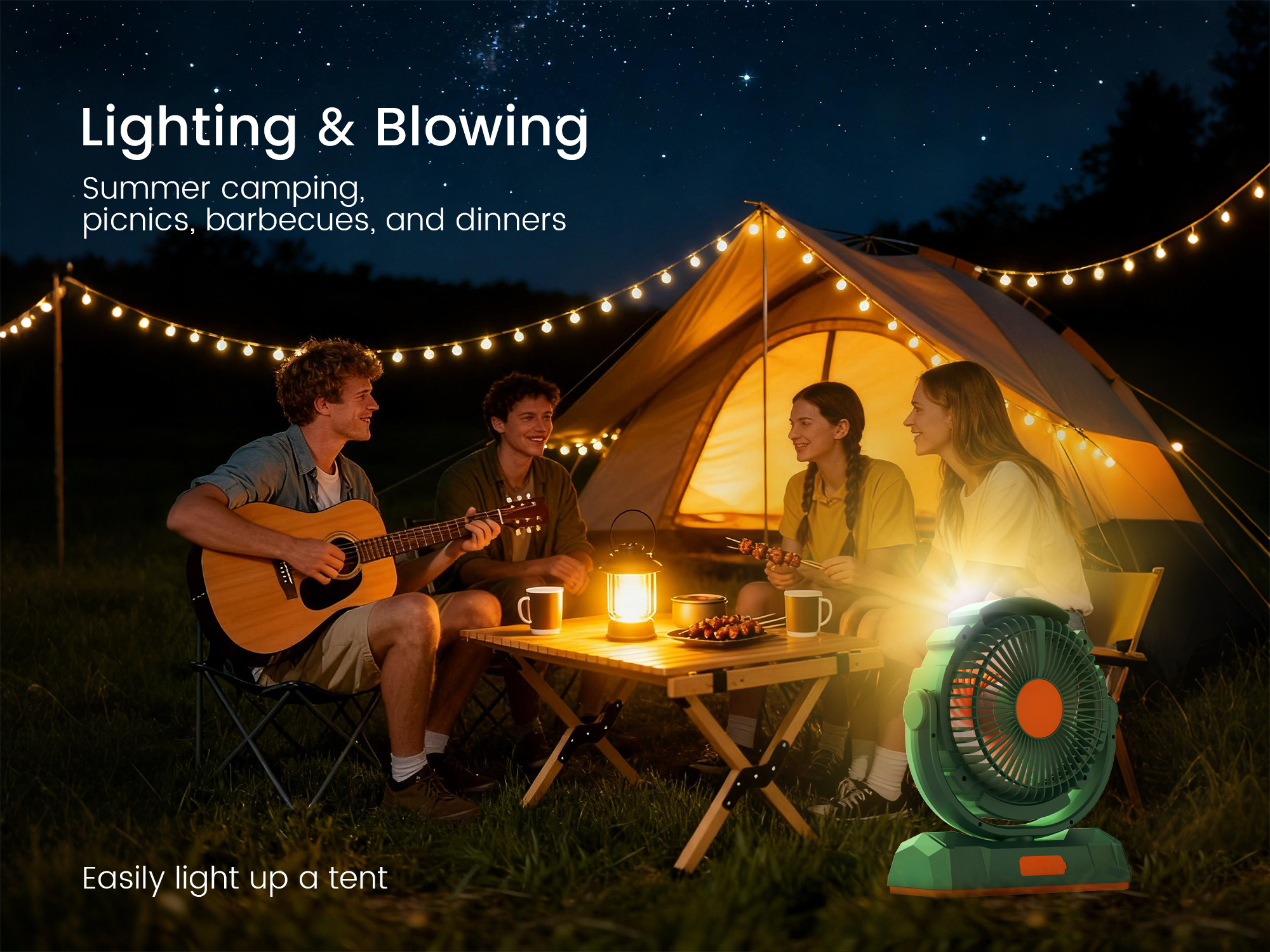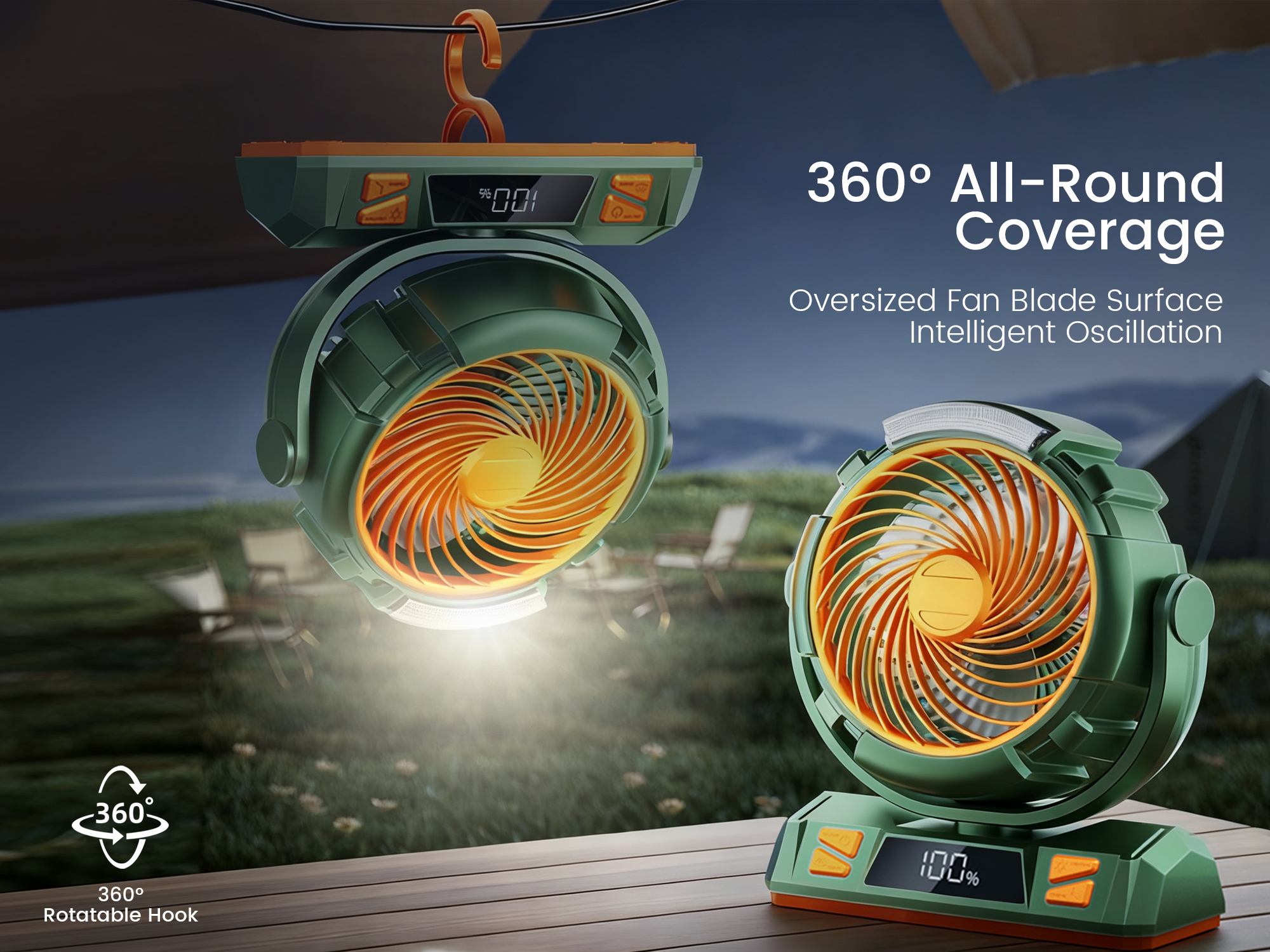 캠핑, 하이킹 및 야외 나이트라이프 해질녘 경치 좋은 캠핑장으로 하이킹하는 모습을 상상해 보세요. 짐을 풀고 M23을 텐트 안에 설치하거나 캐노피 아래 후크에 걸어 매면 됩니다. 휴대용 선풍기는 모닥불 옆에서 휴식을 취하거나 별빛 아래 이야기를 나누는 동안 시원한 바람을 불어넣어 줍니다. 충전식 배터리는 장시간 사용에도 편리하며, 휴대성이 뛰어나 배낭을 가볍고 효율적으로 사용할 수 있습니다.